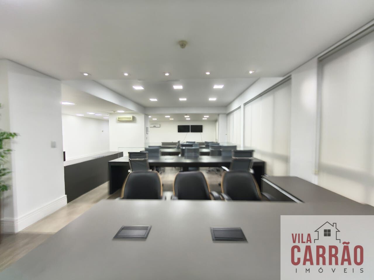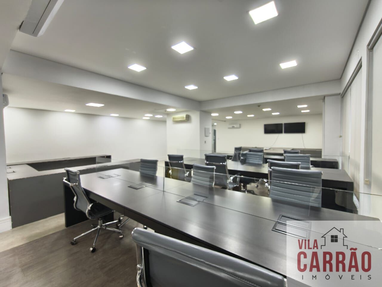 Sala montada, repleta de mobília, com mesas, armários e cadeiras, sala de diretoria com banheiro privativo, diversos aparelhos de ar-condicionado, 2 banheiros (feminino e masculino) para funcionários e copa.